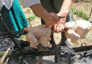 -Para asar, encontrar dos tenedores de madera, aproximadamente el mismo tamaño que entre sí y hundir en la tierra en los extremos de su fuego. Tomar una rama recta de 1.5-2" densamente y afeite en la corteza de la mitad. Lanza el animal pensó parte posterior y hacia fuera el otro lado. Poner en las horquillas y gire con regularidad.