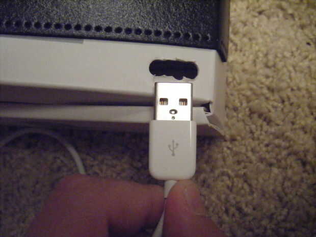 para el primer paso, tomar un sacador de agujero y pund 3 o 4 pasos en una fila como se muestra al extremo macho del USB el cable a través de. y el centro de la almohadilla adhesiva, ésta se apaga la parte superior en la parte posterior a menos que corta. No cortarlo (no mio)