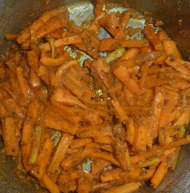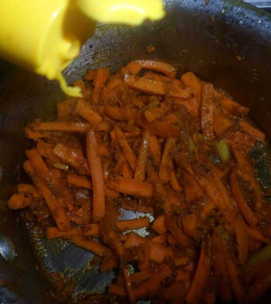 Temple-agregar todas especias-añadir picada zanahorias-mezcla-exprimir limón.