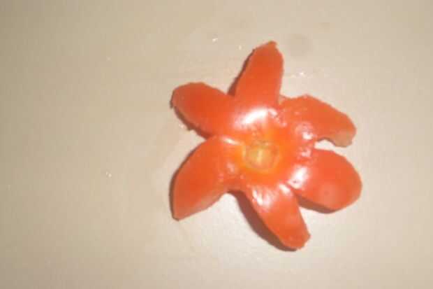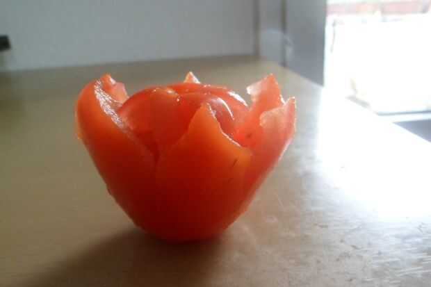 Coloco mi encurtidos en tazas de tomate. Para la preparación de tomate tazas hice un corte en forma de flor cerca de la base del tomate. Base forma la copa después de haber quitado la flor.