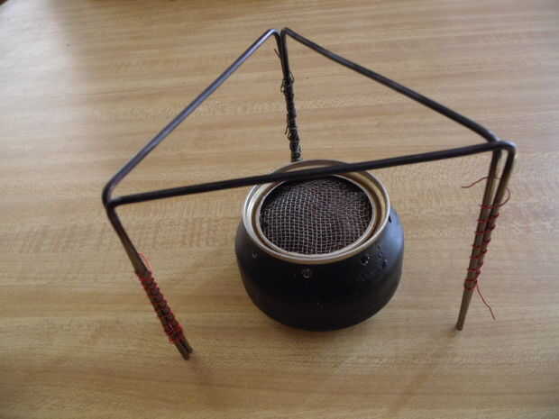 Aquí es el soporte utilice con el pop puede estufa – simple y fácil de hacer – sus tres pedazos de percha de alambre con alambres finos de cobre envuelven alrededor de las piernas. Nada fancy, pero funciona y es rápido de configurar y empaquetar.