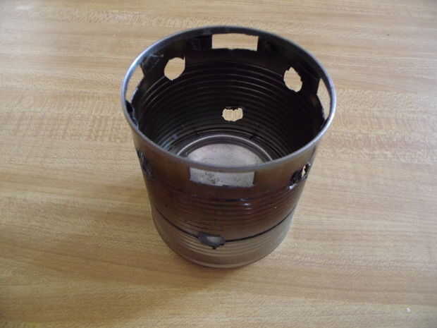 Lo que ves aquí es mi estufa más reciente y probablemente última. Es que simplemente una salsa de tomate de 8 onzas puede con el fondo de una lata pop invertida en la parte inferior. Como veis, he perforado y cortar un número de orificios de ventilación para permitir que respire. No es mucho más grande en diámetro que el pop puede, pero es mucho más estable cuando se está sentado sobre una superficie dura y no requiere un soporte del pote. La altura adicional también le permite hacer tres o cuatro grandes espinas en el suelo para hacerlo sólido si usas al aire libre. Si punta del excedente o exceso de relleno, el derrame suele ser contenido en la parte inferior de la lata.