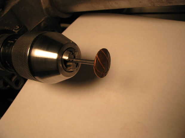 Procede a la soldadura de un clavo de madera en la parte posterior de la moneda. Pero, antes de hacer esto hacer la moneda convexo. Para ello, llama la atención la moneda con la cabeza de un tornillo de carrocería sobre un trozo de madera.
