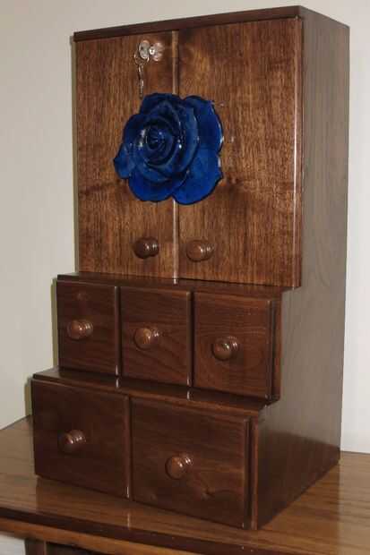 Este gabinete se monta en una pared es lo suficientemente pequeño como para no asumir su habitación pero también incluye el suficiente espacio para colgar una multitud de collares e incluye un montón de cajones para objetos más pequeños.