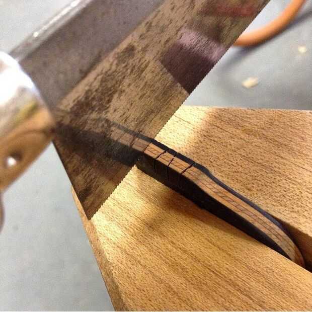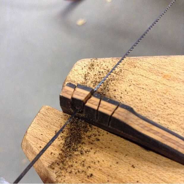 Use una sierra de artesanía otra vez a cortar a la línea de diseño, mientras que los marcos se mantienen estables en una abrazadera. Corté los residuos con una sierra de marquetería, teniendo cuidado de no ir más allá de la línea de diseño. Profundizar en la línea de diseño con un cuchillo afilado, luego pare al resto de los residuos con un cincel pequeño. Limpiar los pines para hacer recto y cuadrado a las líneas de diseño.
