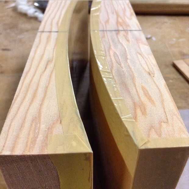 El primer paso en la fabricación de marcos de madera es para crear un formulario en el que puede producir el laminado doblado para el frente de los marcos. Si nos fijamos en las gafas, verá que son curvas a lo largo. Esta curva puede es o no, así sucesivamente un bloque de madera más grande entonces los marcos, esbozar la curva de ligeramente manteniendo los marcos en su lugar. Asegúrese de que trazar una línea de centro para mantenerla recta y use una curva francesa o un compás grande para hacer una línea de corte limpio. Cortar la curva en un solo paso en una sierra de cinta y lijar ligeramente para quitar cualquier rebaba o jorobas. Una superficie ligeramente áspera aquí no importa porque este formulario es sólo para crear la forma. Cubrir ambas superficies de la curva con cinta de embalaje para que el pegamento no se pegue a él, y estarás listo para laminar.