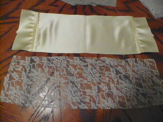 cortar las secciones de la cintura. Pin el cordón del satén y coser alrededor de cada pieza. Coser las secciones posteriores al frente. Tuve que juntar la pretina delantera del raso pero cuando le pongo el encaje encima, tienes que mirar muy de cerca para verlo.