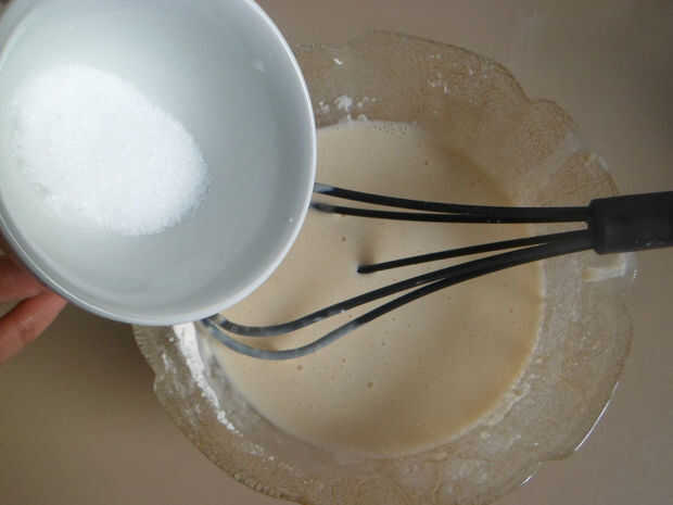 -Tomar harina de todo uso, huevo, leche, azúcar en un tazón de fuente