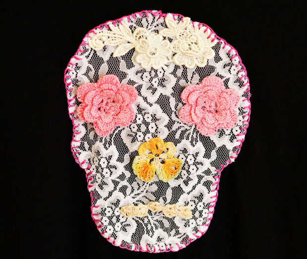 Luego, corté hasta algunos thrifted tapetitos para los ojos, nariz y boca y mano les cosió al cráneo de encaje. Tuve un aplique de encaje floral que como el pelo.
