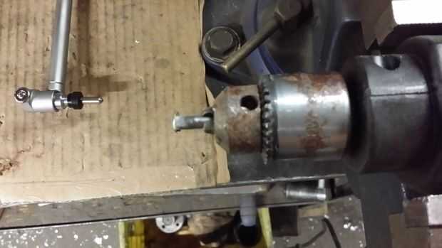 Ahora que cortamos la cabeza del perno prisionero (la mitad que tiene rosca hembra). Poner el taladro en la prensa y garantizar. Instale el perno en el portabrocas con el sólido final hacia fuera. Este es el final que se presenta a forma.