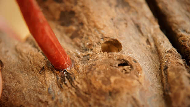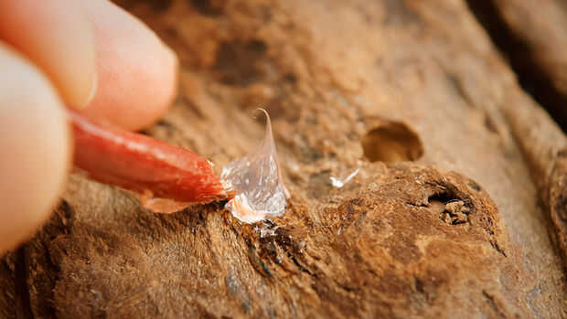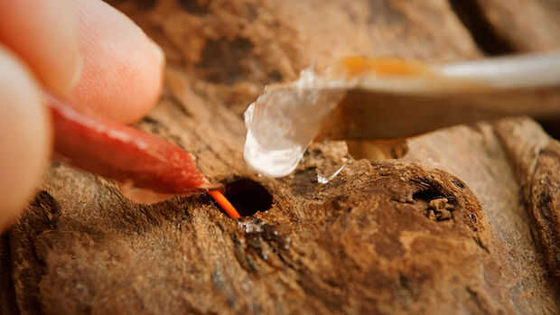 Una vez que ha perforado los agujeros, los cables de potencia a través del hilo de rosca y seguir con una gota de silicona. Empuje el vástago y la silicona hacia abajo en el orificio y limpie cualquier exceso.