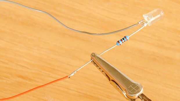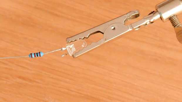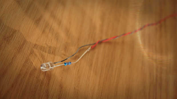 Por último necesitamos un cable negro a la pata negativa del LED (cátodo) y un cable rojo al otro extremo de la resistencia de la soldadura. Cuando termine podemos retorcer juntos para mantener las cosas ordenadas.