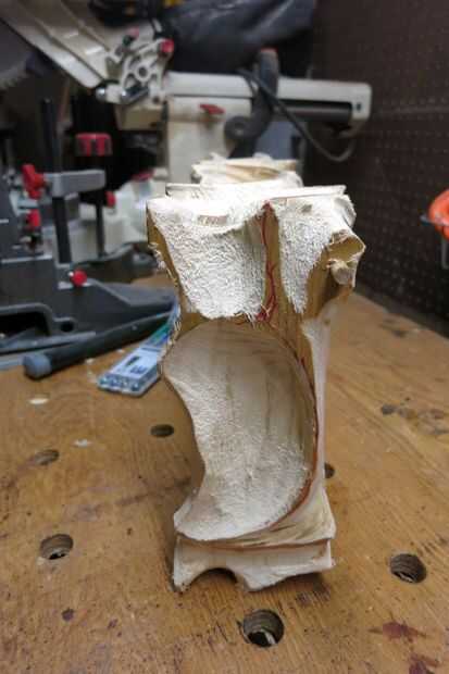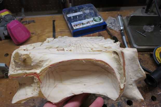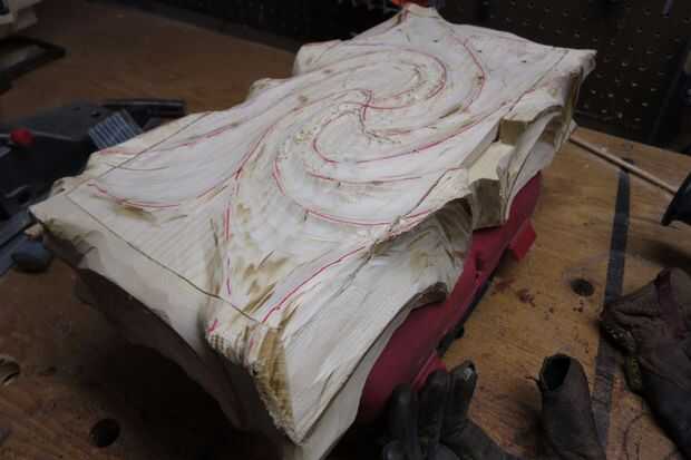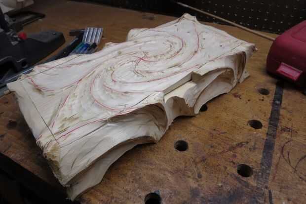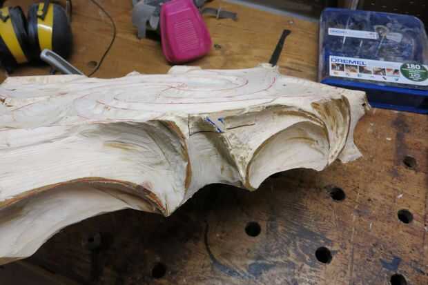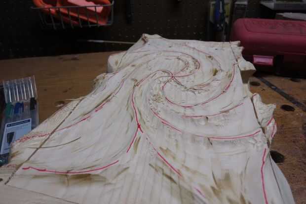 Si desea agregar más intrincadas vueltas, deberás cambiar a una Dremel u otra herramienta rotativa. Mantener el tema con las características redondeadas y hacerlos envolver alrededor de la caja. Al llegar al final, suavemente ronda sobre los bordes mismos y retire cualquier superficie restante del 2 x 4 junto con las marcas de lápiz.