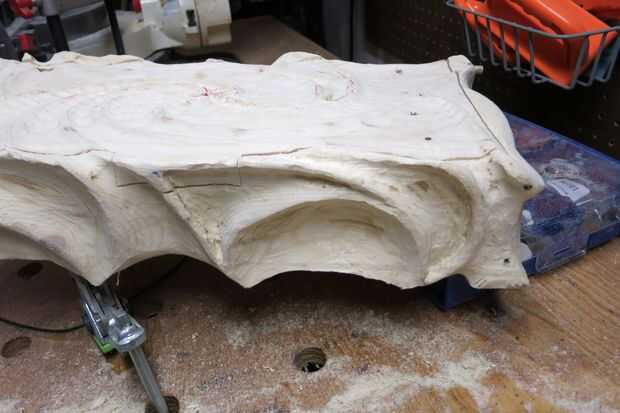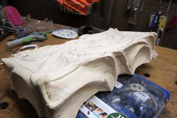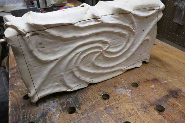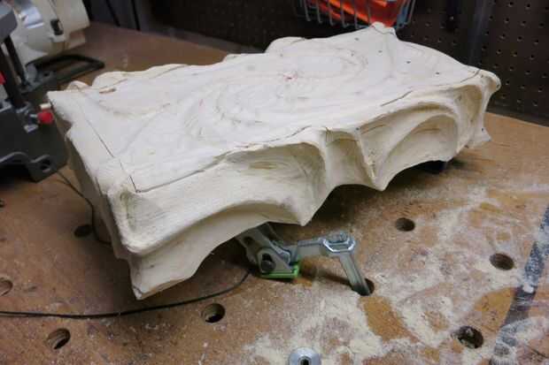 Ahora debe tener una caja esculpida áspera. Para eliminar los arañazos importantes, utilicé una lijadora de aleta en la amoladora angular. Para las esquinas más apretadas y más intrincados detalles usé mi Dremel con una variedad de tambores de lijado.