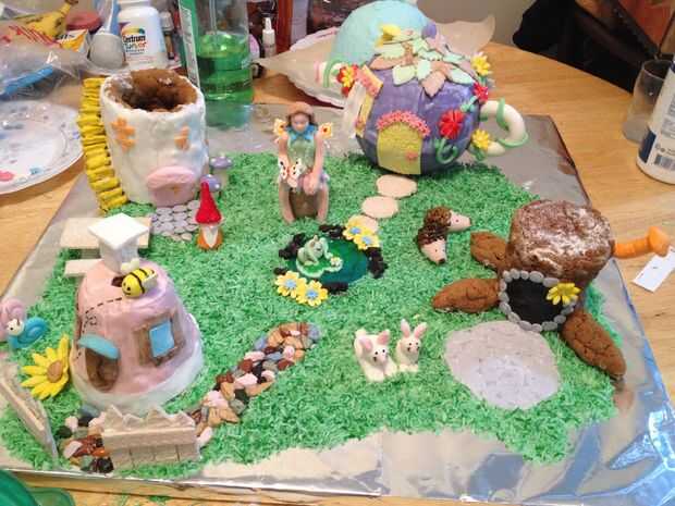 Me había cepillado glaseado real en toda la base y había cubierto con coco color verde como pasto.