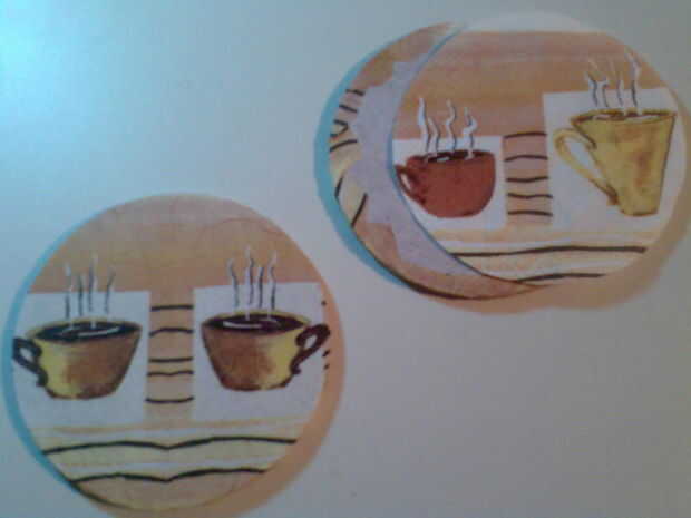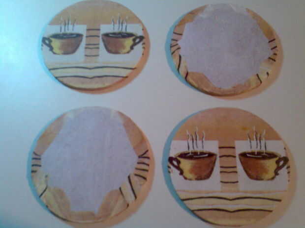 Para esto usé la misma servilleta, sólo que esta vez en lugar de cortar el patrón más grande que el posavasos, cortar círculos que son ligeramente más pequeñas para que alojarte en la parte trasera y no envuelven alrededor del borde para el frente! ;)