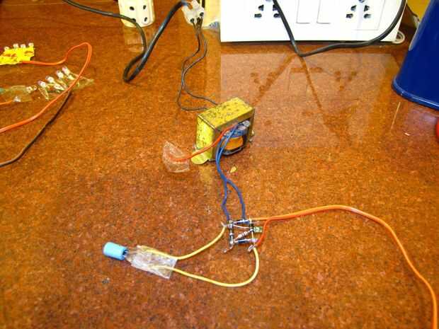 2 > transformador 12V. Utilicé de una antigua antorcha. He añadido también condensador extra limado. Usted también necesitará los diodos si ya no tienes un puente rectificador.