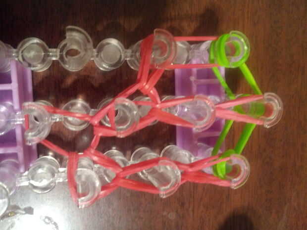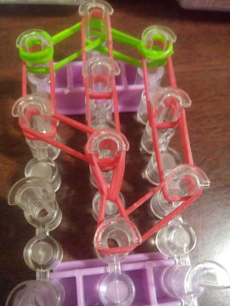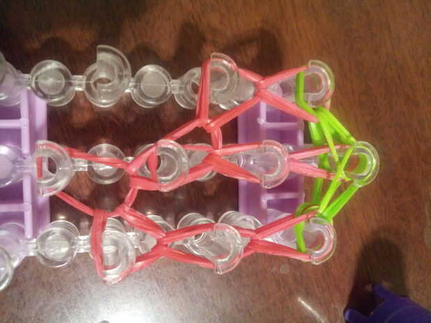 3. lazo de la segunda clavija izquierda en la primera clavija de izquierda y de ahí detrás de las bandas de la tapa del gancho agarrador el único conjunto de lazo doble bandas verdes de la primera a la izquierda en la primera clavija media debería verse como la foto de adelante hacia atrás. ir a la última clavija derecha y lo mismo de derecha a la primera mitad