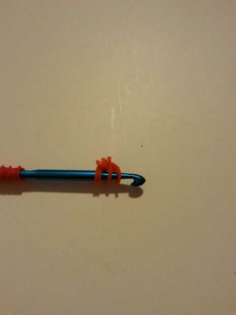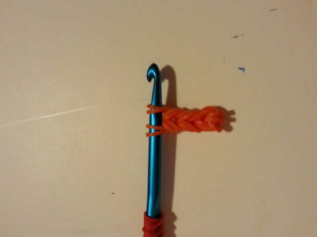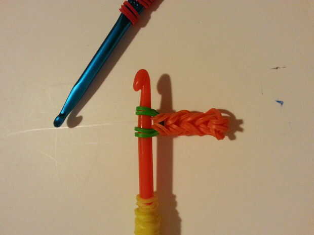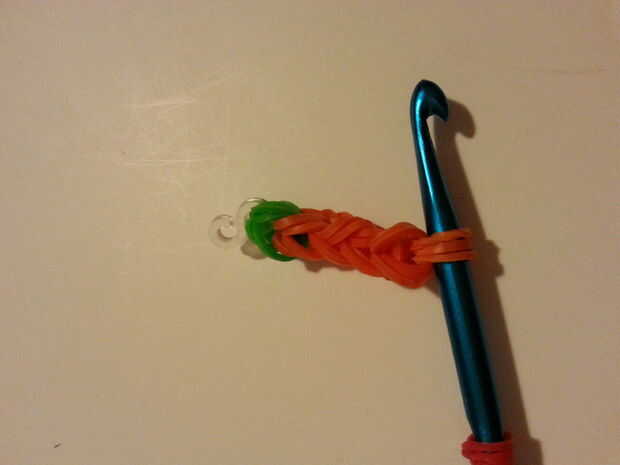 Dos bandas naranja (doble) a través del tapón de rosca y empezar a construir una cadena. Haga la cadena cuatro longitudes y doble bandas verdes por la parte superior del hilo de rosca. Coloque un clip de S mismo las bandas verdes para no desmoronarse. Saque el gancho que se avecina y pasarlo a través de la tapa otra vez.