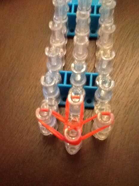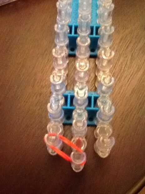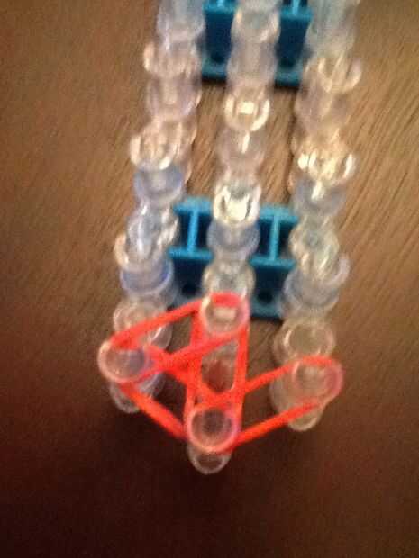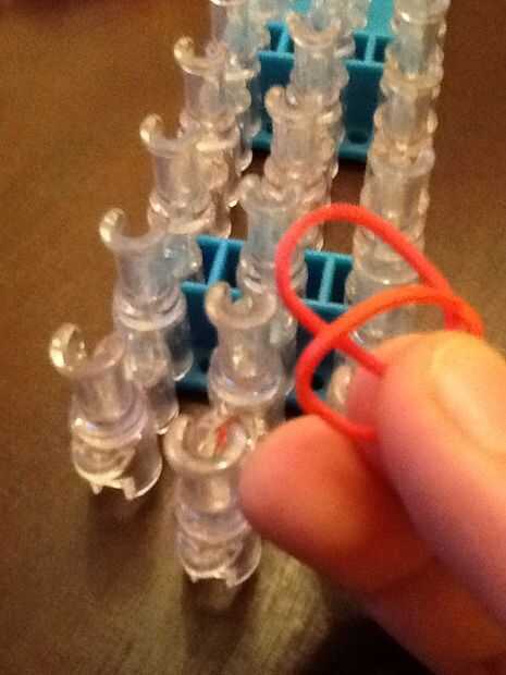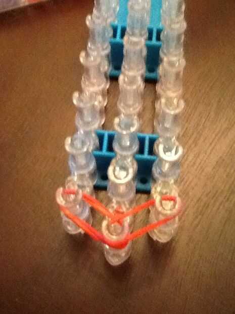 necesita: bandas de un telar del arco iris, un gancho y blanco y negro.Paso 1: Colocación de las bandas Lugar sus bandas en un principio como el triple solo paren en la clavija 4 y mover la banda hacia la derecha y luego haces una línea recta en el c