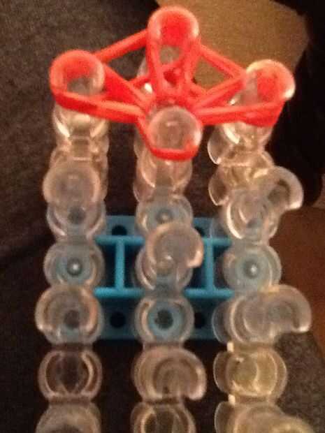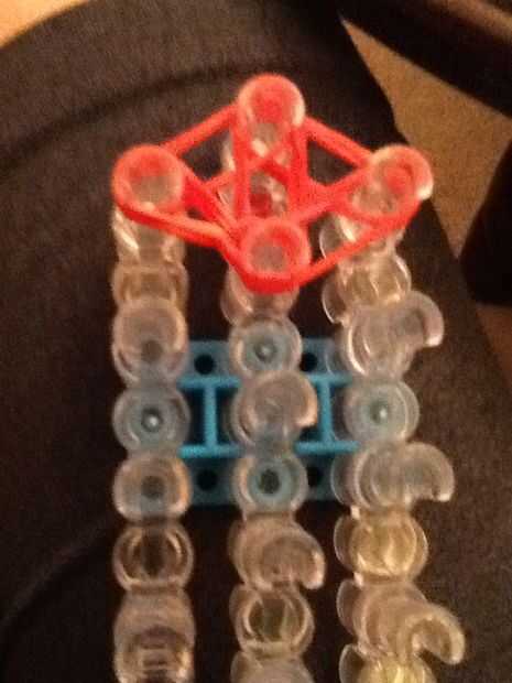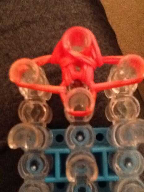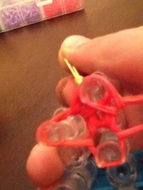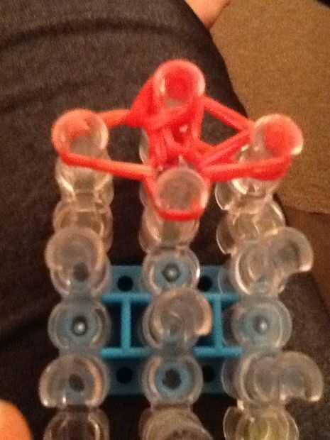 necesita: bandas de un telar del arco iris, un gancho y blanco y negro.Paso 1: Colocación de las bandas Lugar sus bandas en un principio como el triple solo paren en la clavija 4 y mover la banda hacia la derecha y luego haces una línea recta en el c