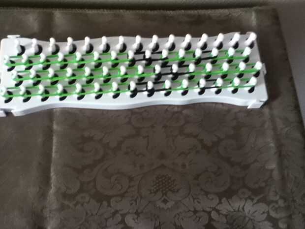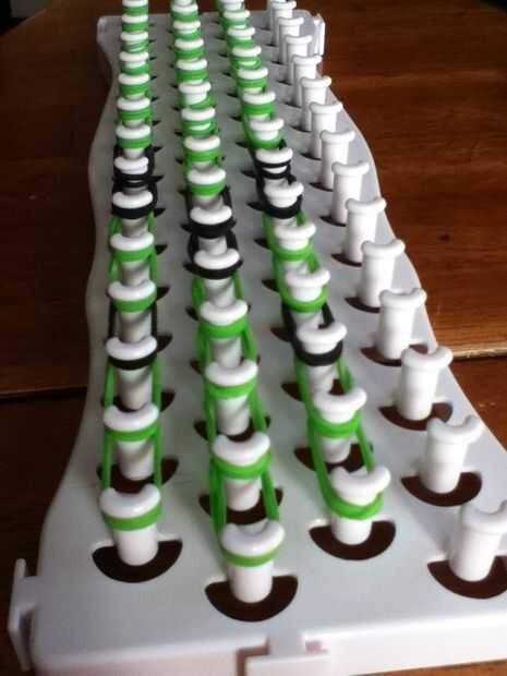 necesita: bandas de un telar del arco iris, un gancho y blanco y negro.Paso 1: Colocación de las bandas Lugar sus bandas en un principio como el triple solo paren en la clavija 4 y mover la banda hacia la derecha y luego haces una línea recta en el c