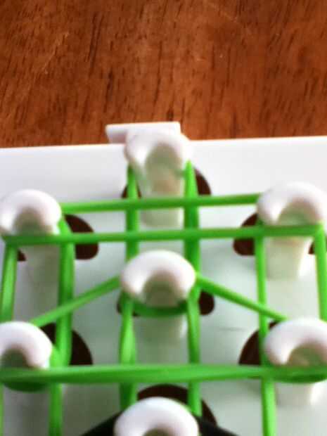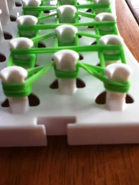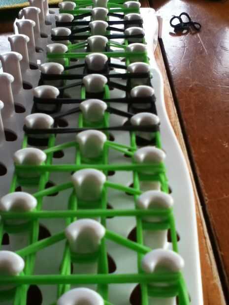 necesita: bandas de un telar del arco iris, un gancho y blanco y negro.Paso 1: Colocación de las bandas Lugar sus bandas en un principio como el triple solo paren en la clavija 4 y mover la banda hacia la derecha y luego haces una línea recta en el c