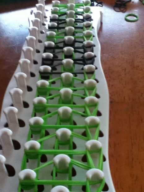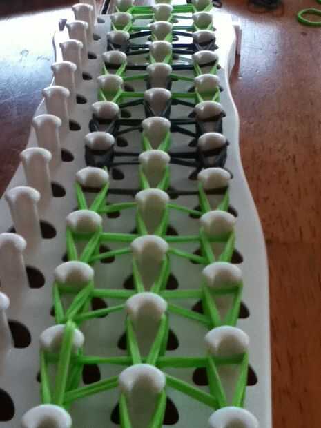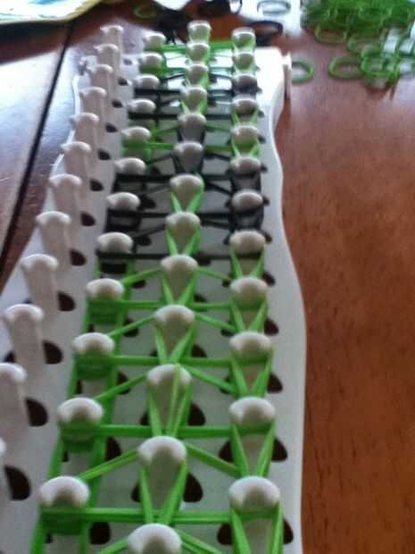 necesita: bandas de un telar del arco iris, un gancho y blanco y negro.Paso 1: Colocación de las bandas Lugar sus bandas en un principio como el triple solo paren en la clavija 4 y mover la banda hacia la derecha y luego haces una línea recta en el c