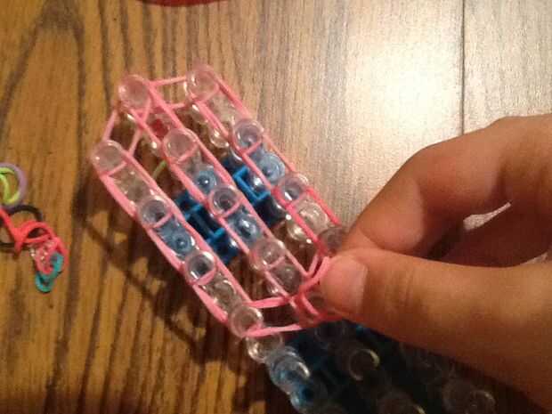 necesita: bandas de un telar del arco iris, un gancho y blanco y negro.Paso 1: Colocación de las bandas Lugar sus bandas en un principio como el triple solo paren en la clavija 4 y mover la banda hacia la derecha y luego haces una línea recta en el c