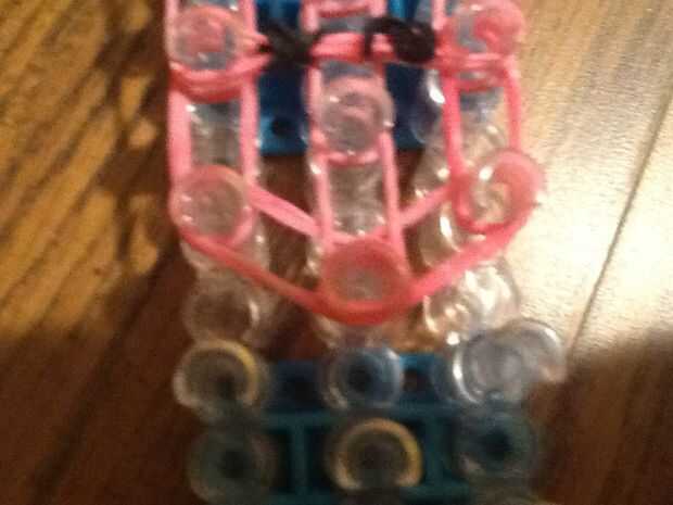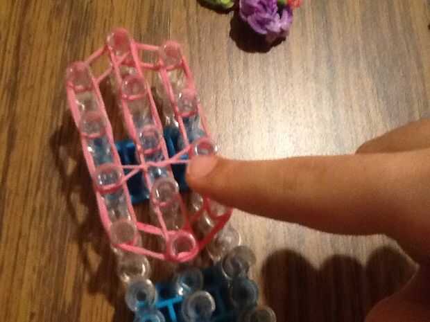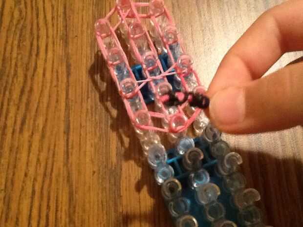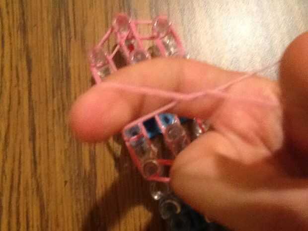 necesita: bandas de un telar del arco iris, un gancho y blanco y negro.Paso 1: Colocación de las bandas Lugar sus bandas en un principio como el triple solo paren en la clavija 4 y mover la banda hacia la derecha y luego haces una línea recta en el c