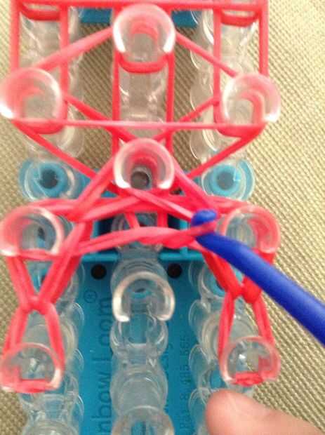 necesita: bandas de un telar del arco iris, un gancho y blanco y negro.Paso 1: Colocación de las bandas Lugar sus bandas en un principio como el triple solo paren en la clavija 4 y mover la banda hacia la derecha y luego haces una línea recta en el c