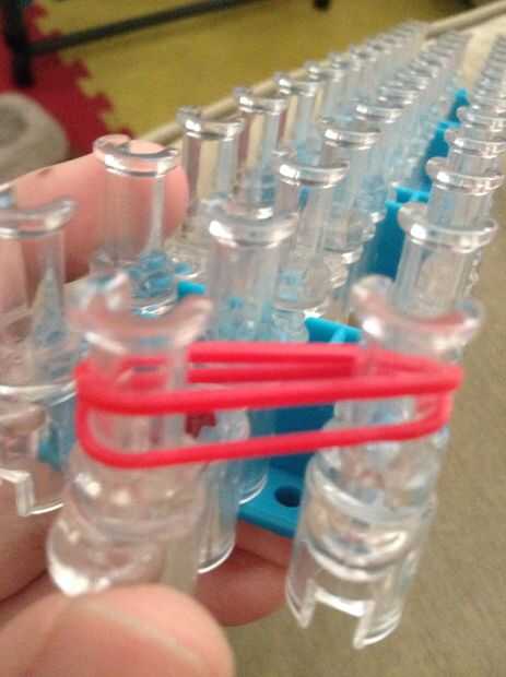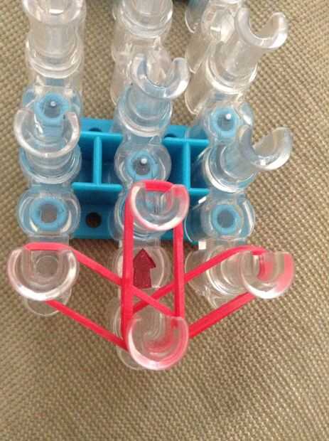 necesita: bandas de un telar del arco iris, un gancho y blanco y negro.Paso 1: Colocación de las bandas Lugar sus bandas en un principio como el triple solo paren en la clavija 4 y mover la banda hacia la derecha y luego haces una línea recta en el c