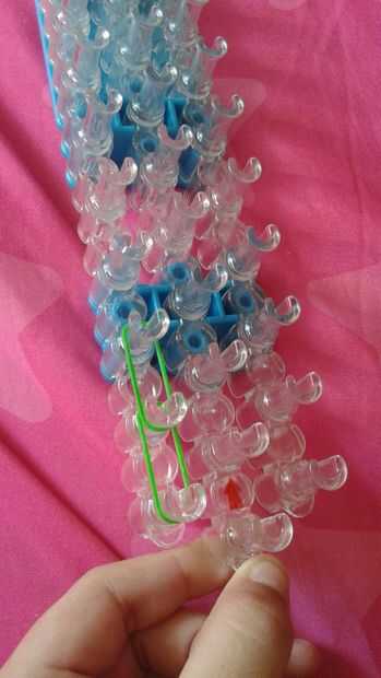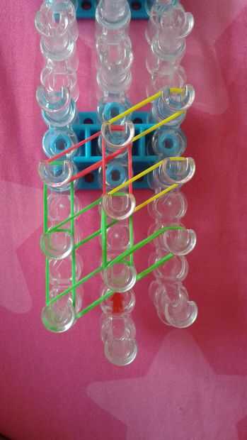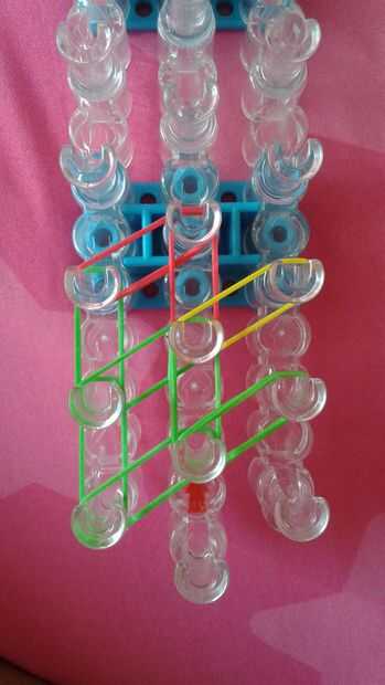 necesita: bandas de un telar del arco iris, un gancho y blanco y negro.Paso 1: Colocación de las bandas Lugar sus bandas en un principio como el triple solo paren en la clavija 4 y mover la banda hacia la derecha y luego haces una línea recta en el c