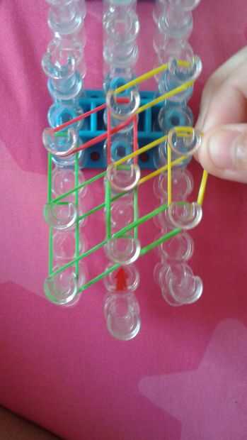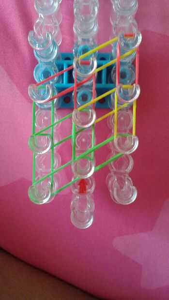 Vamos a utilizar gomas solo para esto. De todos modos, comenzar con la flecha roja apuntando lejos de usted. En el lado izquierdo, en la primera y la segunda clavija, colocar una banda de goma verde. A continuación, coloque otra banda verde en las clavijas de segunda y terceros. Ahora vamos a ir diagonalmente. Tomar una banda elástica verde y se coloca frente a la primera clavija de la izquierda en la segunda clavija en la fila media peg. Hacer lo mismo pero en la segunda clavija izquierda la tercera fila media peg. A continuación coloque una banda de caucho roja diagonal al igual que con las bandas verdes. Vamos a empezar a trabajar ahora en la fila media peg. En primer lugar, tomar una banda elástica verde y estiramiento a través de las clavijas de segunda y tercera. Luego, tome una banda de goma roja y colóquelo en las clavijas terceros y cuarta. Vamos a ahora funcionan diagonalmente otra vez: tomar una banda verde y ponerlo en la segunda clavija en la fila media peg a la fila de la derecha peg en la segunda clavija. Tomar una banda elástica amarilla y hacer lo mismo en la parte superior 2 x. Tomar otra banda amarilla y ponerlo en la clavija de segunda a la tercera en la fila justo clavija. Poner una banda roja en la clavija cuarta.