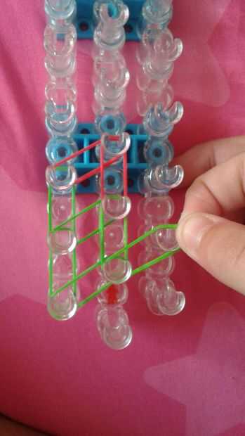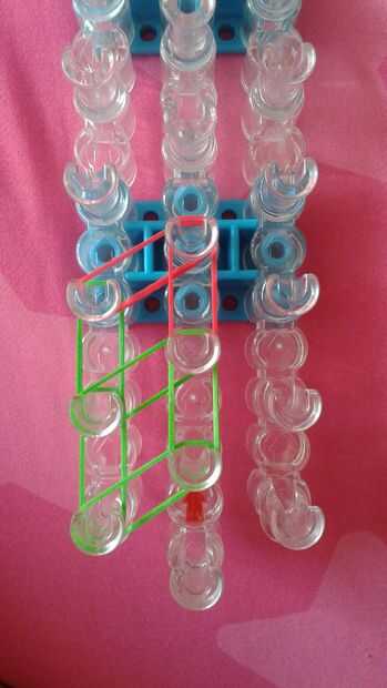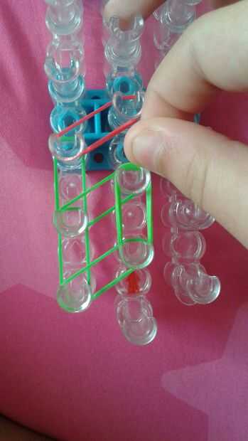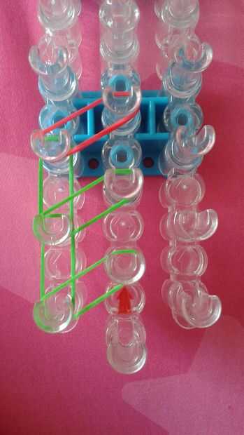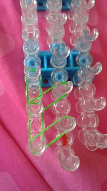 este amuleto es bastante fácil de hacer. Usted necesitará hacer dos de estas si quieres hacer un encanto de cereza doble como se muestra en la imagen.Se necesita:-bandas rojas 11-1 banda verdePaso 1: Agregar las bandas. Tienen el telar con las flecha