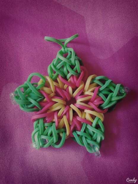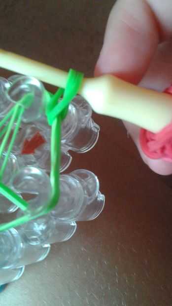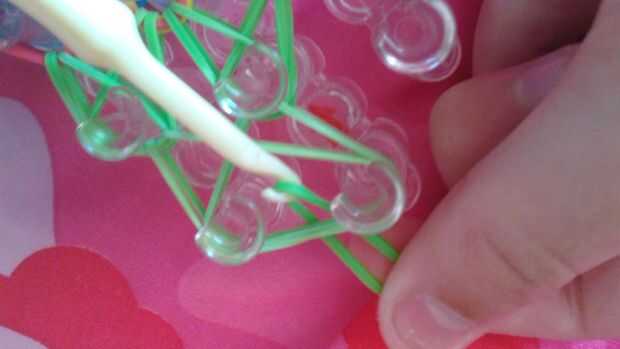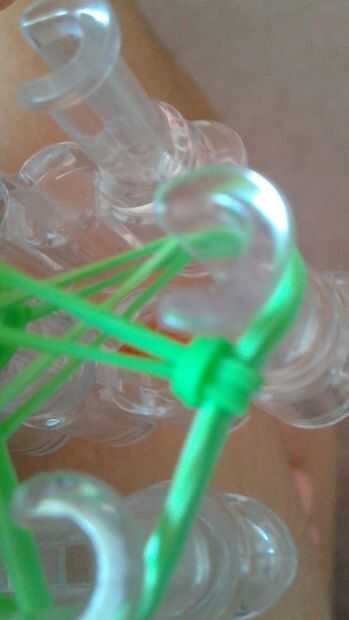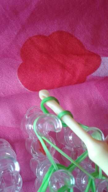 Conseguir una banda elástica verde en su anzuelo y luego ir a través del orificio, con un lado de la goma de la mano y el otro en el gancho. Obtener el lado más cercano al gancho y con la otra. Ahora el lado que ahora está más cercano el gancho con los dedos y deslice el otro lado a través de y usted puede quitar el gancho y ajuste. ¿Quitar los pétalos y usted haya completado su flor!??