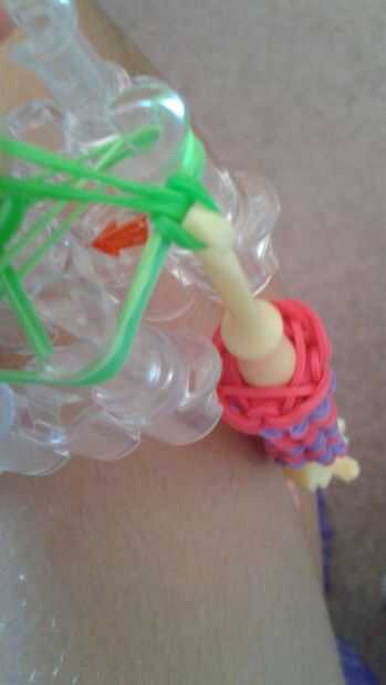 este amuleto es bastante fácil de hacer. Usted necesitará hacer dos de estas si quieres hacer un encanto de cereza doble como se muestra en la imagen.Se necesita:-bandas rojas 11-1 banda verdePaso 1: Agregar las bandas. Tienen el telar con las flecha