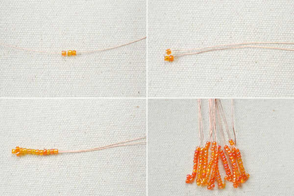1 º, cortar 15cm 0,3 mm cobre alambre, deslice tres rocallas en el hilo, doblarlo por la mitad, después deslice diez granos de la semilla en ambos alambres;