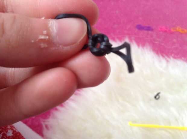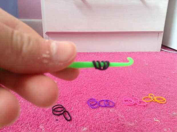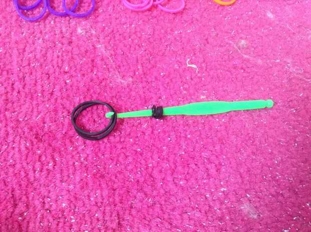 en primer lugar su primera banda de goma que desee para el cuerpo y giro cuatro veces, luego tomar dos gomas del mismo color y poner en el extremo de la hook.next deslícelo sobre las dos bandas negras y luego porque tienes dos bandas de goma en cada lado ponen una gomas dentro de unos a otros hacer lo mismo para el otro lado que debe parecerse a la última foto.
