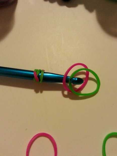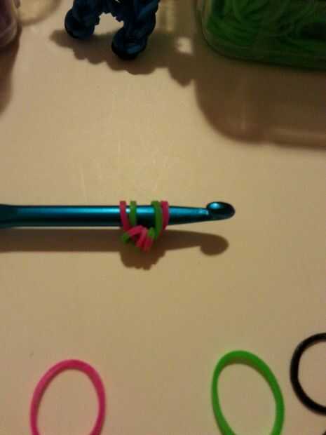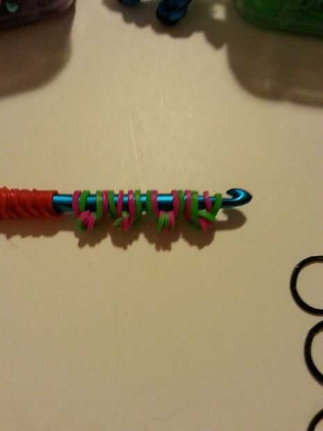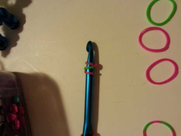 Tomar uno de los colores (4) y serán los que te tapa. (Foto 1) (Estoy usando bandas multicolores para mis bandas tapados) Dos colores a través del tapón de rosca. (Foto 3) Hacer esto tres veces más por lo que tendrás cuatro en su gancho. (foto 4)