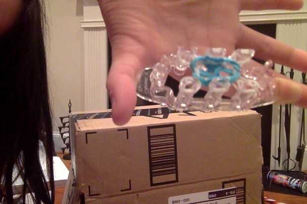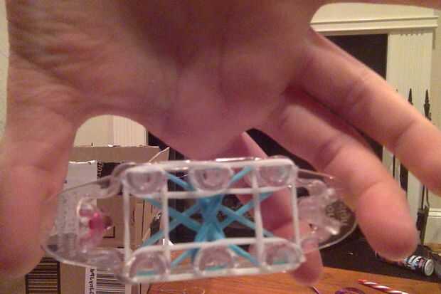 A partir de la fila superior, peg 1, coloque su segunda banda de color de clavija 1 a la clavija 2 de peg 2 a 3, luego peg 3 a clavija de fila inferior 1, luego de clavija 1 a 2, y así sucesivamente hasta que haya alcanzado el punto de partida. Ahora, vas a empezar el bucle. Tomar su gancho y tomar las dos bandas de la parte inferior sobre fondo fila peg 1 y llevarlos. Ahora repita el procedimiento en cada clavija. Vas a repetir que con un color diferente (azul mina) hasta que lo has hecho 3 veces ahora está listo para el siguiente paso.