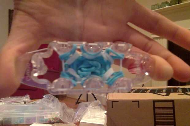 Vas a lazo de la fila superior 1 a 2,2 a 3,3 a fila inferior como normal hasta terminar y lazo de la parte inferior dos más. Ahora vas a poner una banda en su siguiente color sobre clavijas todos excepto 4s y lazo de todas las bandas que no sea el que usted acaba de poner en el sobre que usted acaba de poner el.