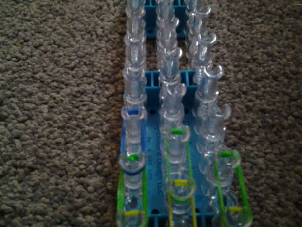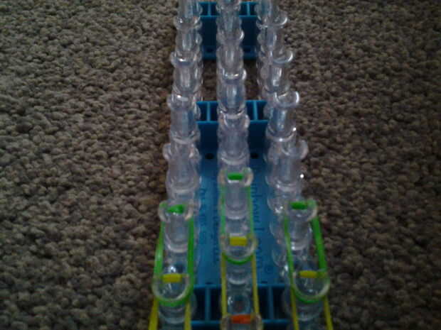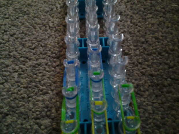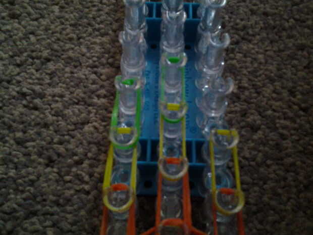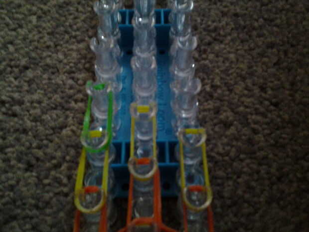 necesita: bandas de un telar del arco iris, un gancho y blanco y negro.Paso 1: Colocación de las bandas Lugar sus bandas en un principio como el triple solo paren en la clavija 4 y mover la banda hacia la derecha y luego haces una línea recta en el c