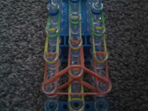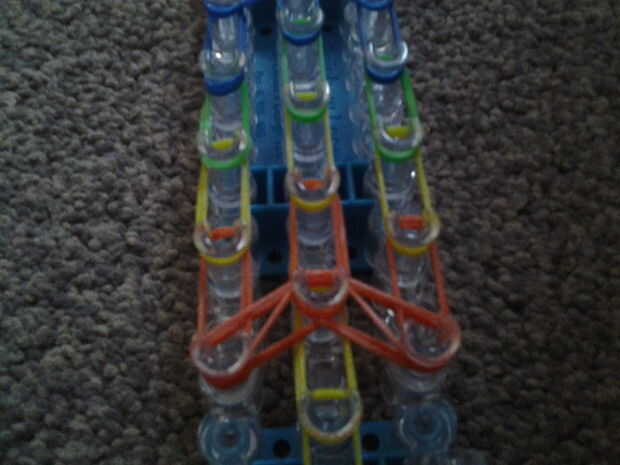 necesita: bandas de un telar del arco iris, un gancho y blanco y negro.Paso 1: Colocación de las bandas Lugar sus bandas en un principio como el triple solo paren en la clavija 4 y mover la banda hacia la derecha y luego haces una línea recta en el c