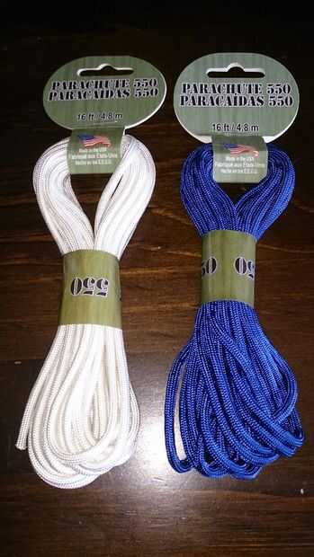 eligió uno o dos colores de paracord. Personalmente elegí el blanco y azul, pero puede utilizarse cualquier color.