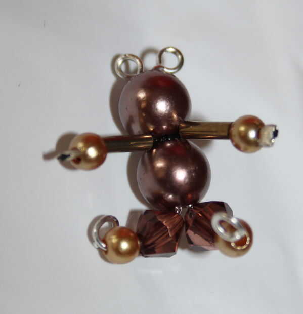Doblar a la izquierda sobre el alambre hacia fuera como las piernas y poner un cordón de 4mm en cada pata y añadir otro grano más pequeño en cada pierna también para pies, luego rizar el hilo sobre como el otro pie,