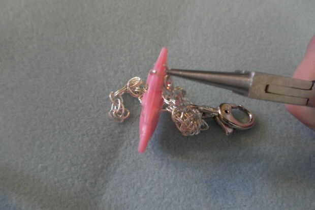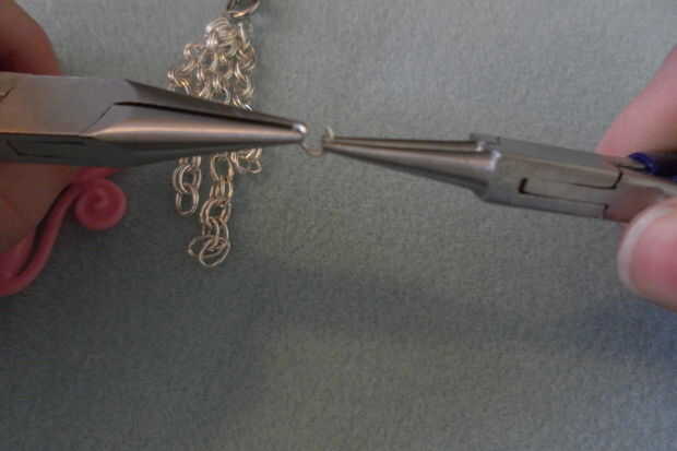 a continuación fije el grano grande a un poco más corto de cadena. Utilizando pinzas twist un salto pequeño bucle abierto atrapar la perla y la cadena interior y gire en su lugar. Coloque los granos más pequeños