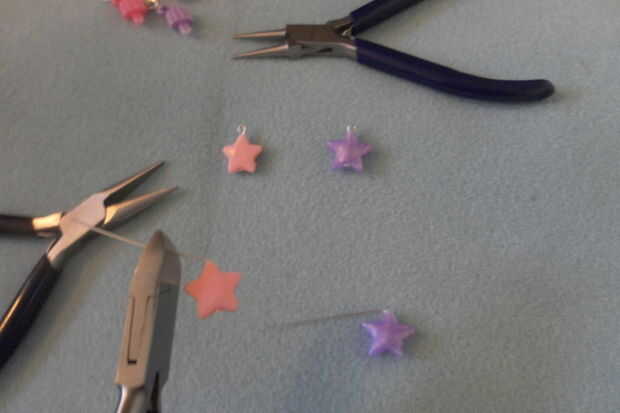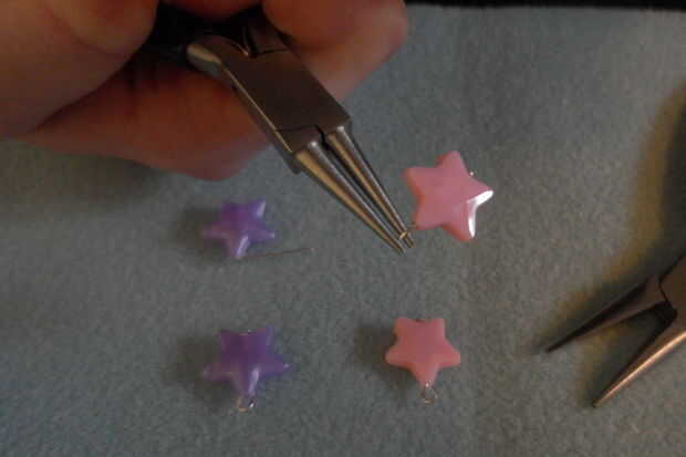 Estrella de granos. Usted tendrá que añadir un lazo a las perlas de estrellas por lo que se les pueden conectar. Para ello tendrá que utilizar un alfiler de cabeza y pinzas. Empuje el perno de la cabeza a través del grano de estrella y corte a medida utilizando el cortador de alambre. Luego empuje la parte superior encima. Ahora necesita agarrar el extremo del perno de cabeza de alambre con la torcedura de alicates redondos de la nariz la espalda de la muñeca para crear un pequeño lazo en la parte superior de la estrella.