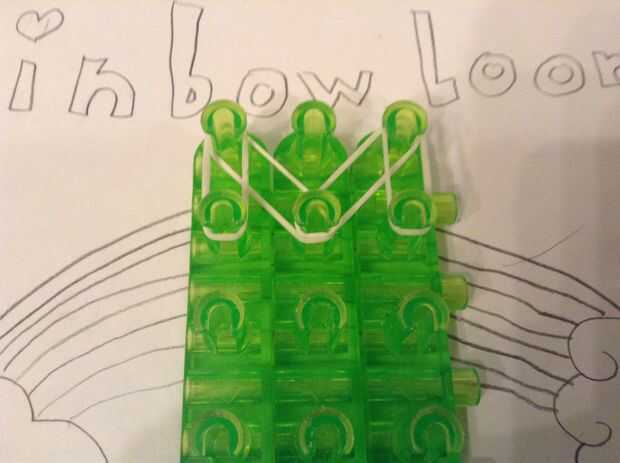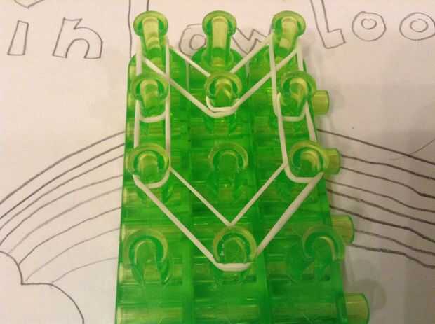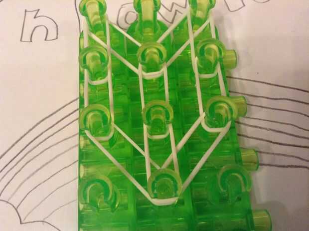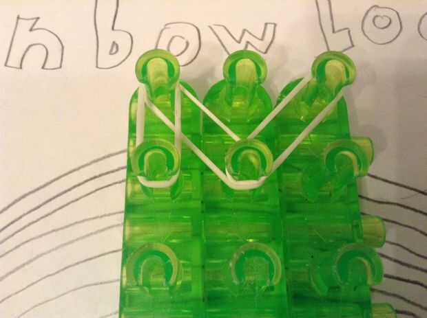 Colocar una banda de la primera clavija izquierda en la segunda clavija media. Luego coloque las bandas de la primera clavija izquierda en la segunda clavija izquierda y la primera clavija derecha en la segunda clavija derecha. Coloque bandas hacia abajo dos veces más, pero la curva en el segundo tiempo. Coloque bandas por la mitad dos veces.