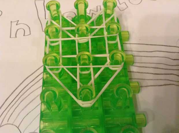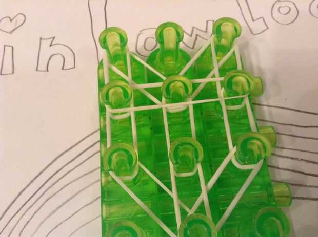 necesita: bandas de un telar del arco iris, un gancho y blanco y negro.Paso 1: Colocación de las bandas Lugar sus bandas en un principio como el triple solo paren en la clavija 4 y mover la banda hacia la derecha y luego haces una línea recta en el c